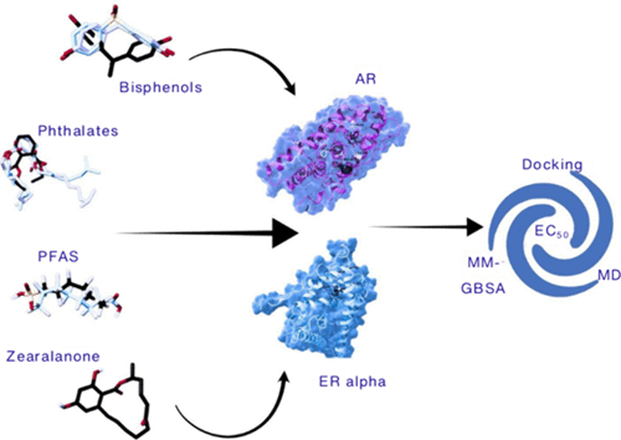 For the androgen receptor, the picture was one of antagonism: these chemicals bind to AR and block it, preventing the body’s natural androgens from doing their job. The MD simulations helped explain why, by revealing specific molecular interactions that stabilize the chemical inside the receptor’s binding pocket and interfere with the normal signalling mechanism.